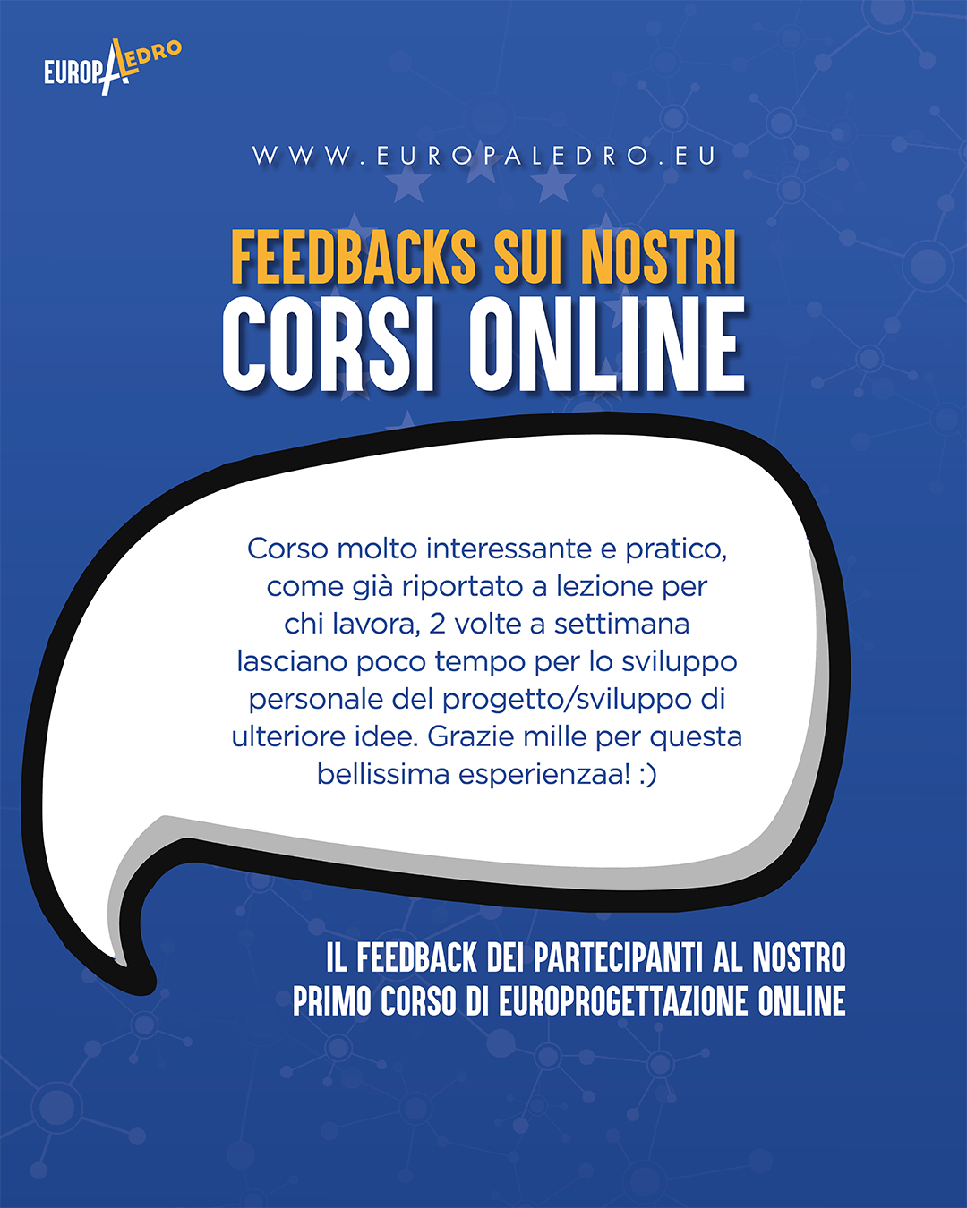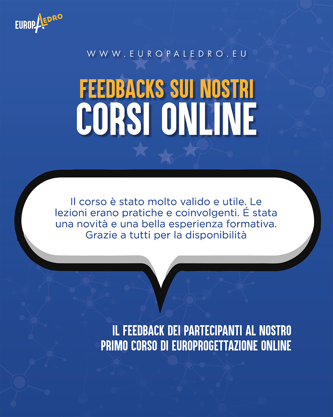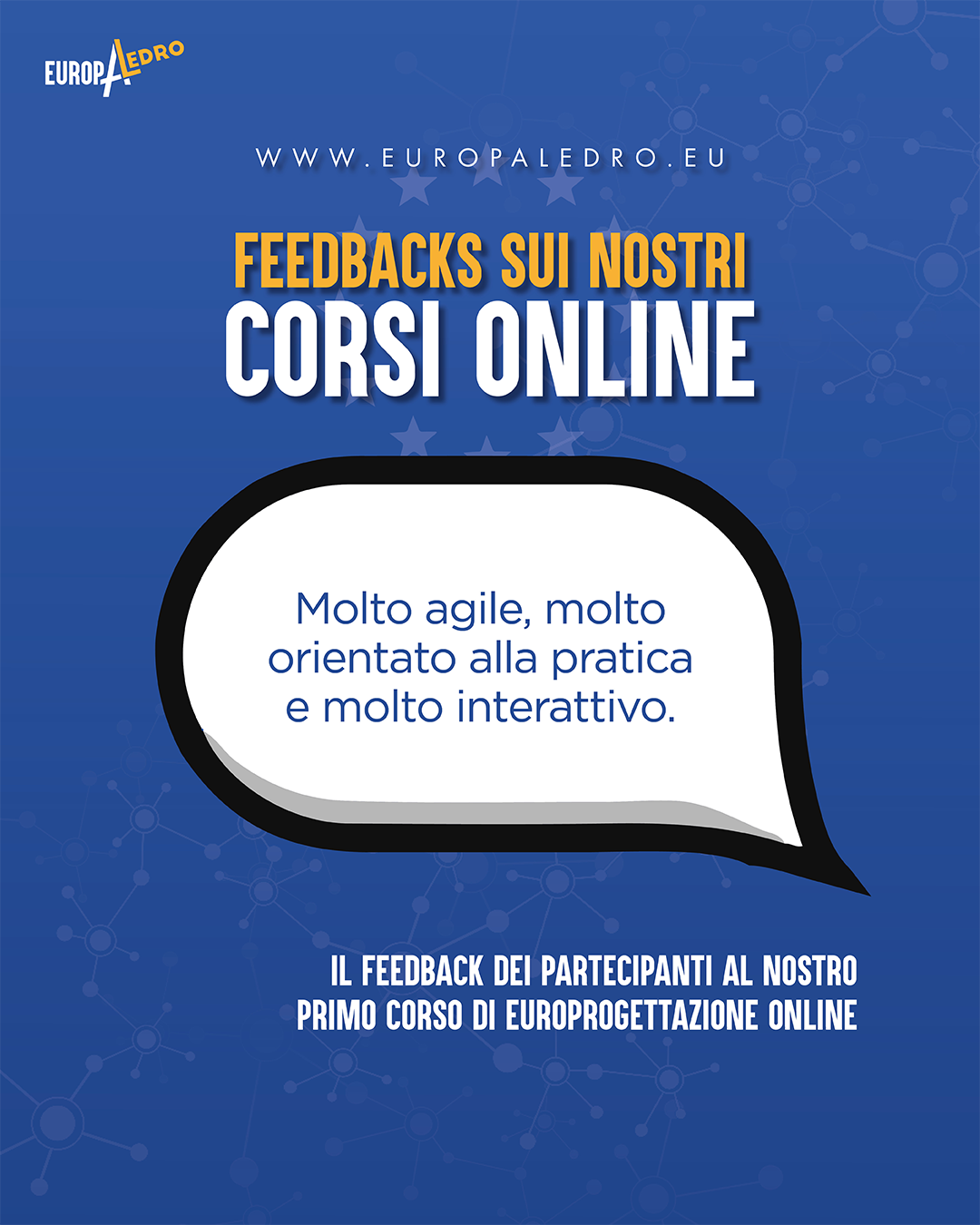 Offriamo un corso di Europrogettazione Online dove potrai studiare con tutta tranquillità, con accesso a videolezioni, materiale offline ed esempi concreti su come orientarti nel mondo dei bandi europei.
